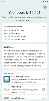 This Anxiety Test is designed to help you evaluate the severity of your anxiety with just seven simple questions. This app uses the Generalized Anxiety Questionnaire (GAD-7), an empirically-based, self-test questionnaire. It is also sensitive for other anxiety disorders as well such as specific phobia, panic disorder, and social phobia. These disorders generally respond positively to treatment, so it is important to seek treatment if you are concerned about your mental health.