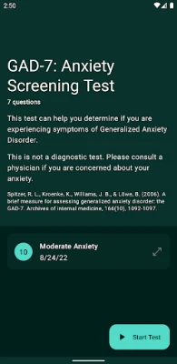 DISCLAIMER: This self-test is not meant to be a diagnosis for your anxiety. Please consult your physician if you are concerned about your symptoms. This app should not be used as a replacement for professional treatment or guidance.