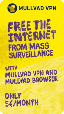 Free the internet from data collection with Mullvad VPN – a service that helps keep your online activity, identity, and location private. Only €5/month.