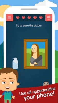 There are 131 creative and tricky puzzles. If you want to solve them you have to show all your observation and logic. This game is the most interesting, creative and the most idiotic full of difficult and unordinary tasks! It is unusual IQ test,shake, twist and kiss your phone. Use all opportunities of your phone!